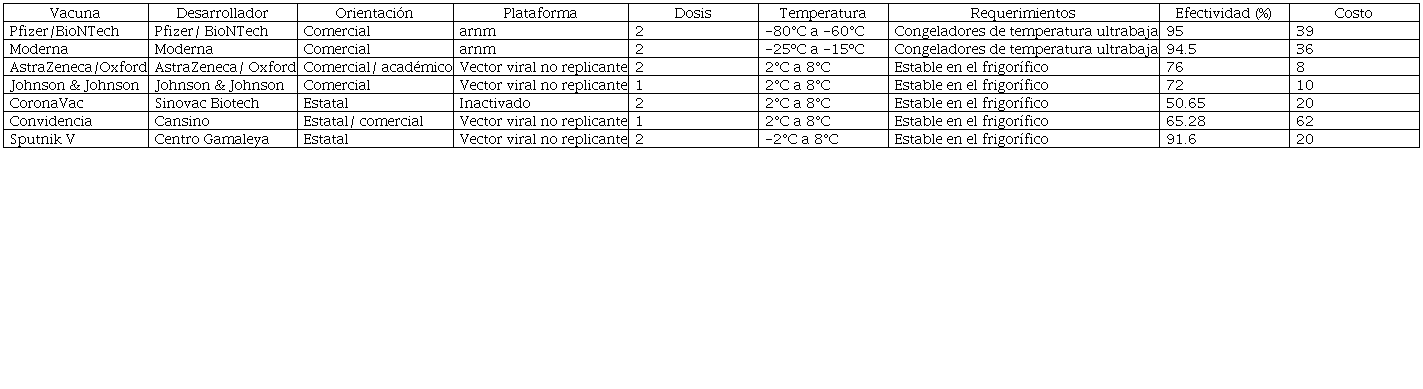 La plataforma empleada en Convidencia, CoronaVac y Sputnik V ha resultado en características técnicas que facilitan una distribución más amplia en el Sur global, así como una potencial transferencia de la tecnología y la manufactura. No obstante, su acceso es negociado en acuerdos bilaterales entre gobiernos que dan preferencia a una lógica política sobre objetivos económicos o sanitarios. El entorno de escasez y el control en el suministro son favorables para la capitalización de dividendos políticos y pueden constituir una limitante a la transferencia tecnológica. Asimismo, la menor efectividad de Convidencia y CoronaVac puede traducirse en una pandemia más prolongada y retrasar la recuperación sanitaria y económica de estos países, en comparación con el Norte global.129 Además, el incumplimiento en los estándares internacionales de manufactura ha retrasado la inclusión de Sputnik V en el listado de vacunas autorizadas para uso emergente de la OMS,130 un aspecto clave en la reapertura de fronteras.