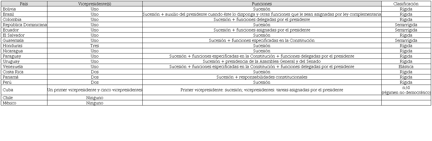 De 19 países, 13 incorporaron en sus constituciones la figura de un vicepresidente. De esos, cuatro establecen la sucesión presidencial como único fin de este cargo (Bolivia, República Dominicana, El Salvador y Honduras); en otros tres: Colombia, Ecuador y Nicaragua, además de su función de sucesión, el vicepresidente desempeña -según la Constitución- las actividades que el presidente le delegue; las constituciones de Guatemala, Paraguay y Venezuela determinan que el vicepresidente sucederá al presidente cuando sea necesario, además de llevar a cabo una serie de funciones establecidas en el propio texto constitucional y las que el presidente le asigne. En Uruguay el vicepresidente es presidente de la Asamblea General y del Senado. Finalmente, en el caso de Brasil, el vicepresidente debe auxiliar al presidente cuando éste lo disponga y se le pueden asignar otras responsabilidades por ley complementaria.