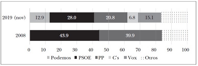 En los procesos electorales y políticos ocurridos de 2008 a 2019, se transformó la relación de fuerzas entre los partidos políticos españoles. Esto es notable cuando se comparan los resultados electorales de 2008 con los de noviembre de 2019: el debilitamiento del PP y del PSOE fortaleció a Podemos y a Ciudadanos. Véase la Gráfica 1.