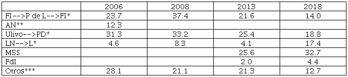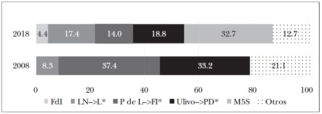 Después del colapso de 1992-1994, en la reconstrucción del sistema de partidos italiano se habían logrado consolidar dos fuerzas políticas mayoritarias, Forza Italia y el Partido Democrático. Sin embargo, la crisis de la eurozona y la crisis migratoria contribuyeron al debilitamiento electoral de ambas y favorecieron al ascenso de otras fuerzas políticas como M5S y la Lega. Véase la gráfica 2.