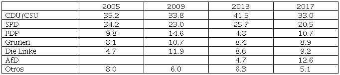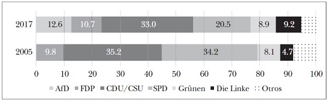 Así, entre 2005 y 2017, los dos principales partidos políticos alemanes, CDU/CSU y SPD se debilitaron, mientras que a la derecha se fortaleció AfD y, a la izquierda, aunque menos, Die Linke. Véase la gráfica 3.