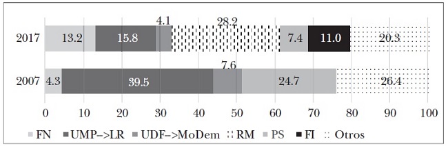 Los resultados electorales en la primera vuelta de la elección de diputados de junio de 2017 (al igual que los comicios presidenciales de mayo61) pusieron de relieve el fraccionamiento político del electorado.62 LR obtuvo 15.8% y el PS 7.4%; es decir, los dos partidos que hasta entonces habían sido mayoritarios, juntos ya sólo lograron sumar 23.2% de los sufragios. El centro derecha perdió más de 11 puntos y el centro izquierda retrocedió 22 puntos. En contrapartida, la recién fundada RM se benefició al obtener 28.2% de la votación. FI obtuvo 11.0% y el FN captó 13.2% de los sufragios para elegir diputados (a diferencia de 21.3% que consiguió en la presidencial). Este trastocamiento de las preferencias partidarias fue una revuelta electoral mayor.63 Por supuesto, la segunda vuelta alteró las preferencias electorales de los que votaron por candidatos que no quedaron en primer o segundo lugar.