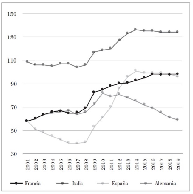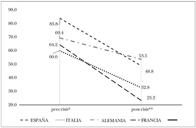 Durante la crisis de la deuda soberana de varios países de la UE en 2009-2012, el euro se tambaleó,10 y la respuesta de las instituciones supranacionales ligadas a la UE (Comisión Europea y Banco Central Europeo, así como el Fondo Monetario Internacional, conocidas como la Troika) fue la de imponer severas políticas de austeridad a los gobiernos con dificultades fiscales y con una elevada deuda soberana. La instrumentación y aplicación de dichos lineamientos de austeridad estuvieron a cargo de los gobiernos nacionales en turno y fueron éstos los que tuvieron que enfrentar en las urnas a los indignados electores que resultaron afectados negativamente por tales medidas. La política de austeridad conllevó, como es usual desde hace cuatro décadas, elevados costos sociales (desempleo, deterioro del sistema de pensiones, disminución del ingreso real, declive de determinadas regiones, recortes severos al gasto social del sector público). Los daños sociales no sólo afectaron a los países con mayor endeudamiento, también afectaron negativamente, aunque en menor medida, al resto de integrantes de la UE. Los índices de desigualdad de la distribución del ingreso continuaron ahondándose11 y el desempleo creció.12 La crisis financiera de 2008-2009 y la subsecuente recesión agravaron la situación.
