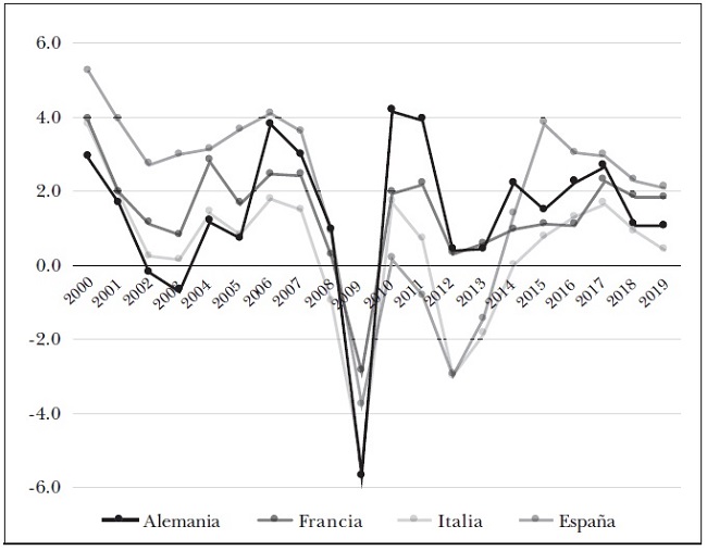 En lo que va del siglo XXI, grandes conmociones económicas y sociales sacudieron los procesos electorales nacionales de los mayores países que integran la Unión Europea (UE). Esos comicios se caracterizaron por notables reacomodos en las preferencias partidarias de una parte significativa de los electores, lo que se tradujo en un mayor fraccionamiento en la estructura de sus sistemas nacionales de partidos. Esos cambios pusieron en evidencia el debilitamiento de las bases sociales de los partidos mayoritarios tradicionales (genéricamente aludidos como de centro-izquierda y de centro-derecha o moderados); también favorecieron tanto el crecimiento de partidos menores preexistentes, como la emergencia de nuevas organizaciones políticas. Estos partidos menores podían adoptar, ya fuese posiciones euro es cép ticas, o bien actitudes antimigratorias e identitarias nacionalistas, o bien, en otras ocasiones, ser muy críticas del establishment político nacional por su incompetencia o por su corrupción. Esos tres temas permearon, en dosis variables, las campañas electorales de estas dos décadas. Nuestro objetivo es revisar el entreveramiento de sucesos supranacionales ocurridos en el periodo 2000-2019 en la UE con las elecciones nacionales realizadas en cuatro de sus mayores integrantes en la actualidad: Alemania, Francia, Italia y España. En este periodo, el Reino Unido aún formaba parte de la UE y era una de sus mayores economías, pero su peculiar situación en los años que precedieron y siguieron al referéndum de 2016, en torno a su salida o su permanencia en la UE, complica el análisis que bien amerita el tema, pero que requeriría en sí mismo un tratamiento por separado; por esta razón, no lo hemos incluido en este estudio.