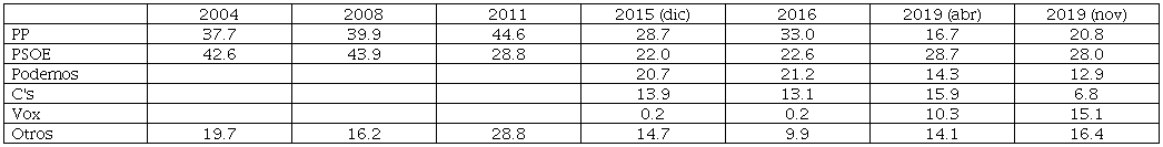 En las elecciones de abril de 2019, con tan sólo 28.7% de los votos, el PSOE logró la victoria, en detrimento de Podemos, que retrocedió siete puntos y sólo reunió 14.3% de votos. El voto de la derecha se dividió y se redistribuyó: el PP registró una gran caída y sólo alcanzó a captar 16.7%, mientras que Ciudadanos remontó a 15.9% y Vox a 10.3%. En esta ocasión, los dos partidos tradicionalmente de centro ya sólo sumaron 43 puntos, menos de la mitad de los votos. Las discusiones para formar gobierno fracasaron, básicamente por el rechazo del PSOE de incluir a Podemos en el gabinete de gobierno. No quedó otra opción, más que convocar de nuevo a elecciones para noviembre de 2019. En esa nueva ronda, el PSOE obtuvo 28.0% de los votos; Podemos, 12.9%, el PP, 20.8%; Vox, 15.1%, y Ciudadanos retrocedió a 6.8%. La gran novedad fue que, por fin, el PSOE y Podemos acordaron la formación de un gobierno de coalición, ya no de centro, sino cargado hacia la izquierda.