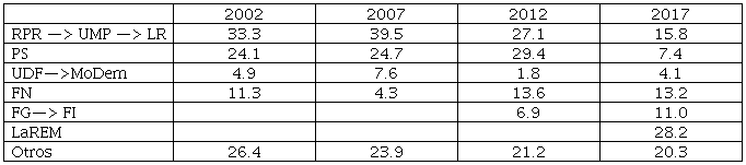 Los años que precedieron a la crisis financiera internacional de 2007-2008 transcurrieron bajo la segunda gestión presidencial de Jacques Chirac (2002-2007), la cual estuvo plagada de numerosos conflictos.54 En la primera vuelta de la elección de diputados de 2002, destacaron cuatro partidos: en primer lugar, el Ressemblement pour la République (RPR, Reunión para la República), de resabios gaullistas, obtuvo 33.3 % de los sufragios; en segundo lugar, el socialdemócrata Parti Socialiste (PS, Partido Socialista) captó 24.1%; en tercer lugar, el Front National (FN, Frente Nacional) de inclinación anti UE y antimigrantes, atrajo 11.3% de los sufragios; y, en cuarto lugar, la Union pour la Démocratie Française (UDF, Unión por la Democracia Francesa), de componentes democristianos y liberales, consiguió 4.9%. En ese año, los dos mayores partidos, RPR y PS, captaron conjuntamente 57.4% de los sufragios en la primera vuelta de diputados.