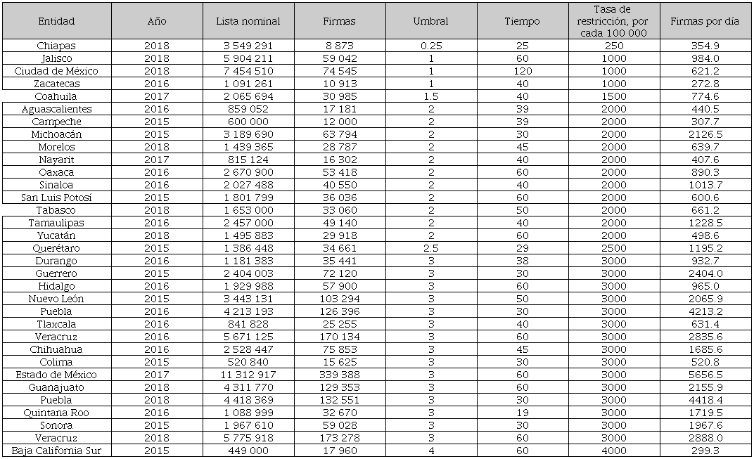 Una revisión en detalle de los datos muestra algunas paradojas difíciles de explicar. Por ejemplo, Chiapas es la entidad con menor umbral (0.25) pero con una lista nominal de poco más de 3.5 millones, mientras que Baja California Sur tiene el umbral más alto con una lista nominal menor al medio millón; dos entidades -la Ciudad de México y Jalisco- aparecen con listados nominales grandes y umbrales de 1%, en contraste está Veracruz, que con un listado nominal semejante al de Jalisco, solicitó el 3%, misma cifra solicitada por el Estado de México, que posee la mayor lista nominal con 11.3 millones; y, por último, Quintana Roo concedió 19 días para conseguir más de 32 000 firmas, en cambio, Ciudad de México otorgó 120 días para recolectar poco más de 74 000 firmas.