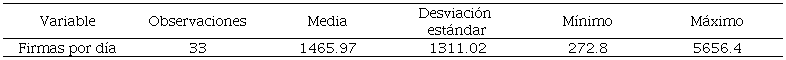 Una manera de clasificar las entidades fue a partir del esfuerzo que les representa a los aspirantes obtener el apoyo ciudadano en términos de la cantidad absoluta de firmas y el tiempo disponible para hacerlo, lo que se capturó mediante el indicador firmas de por día. La clasificación de los estados se hizo a partir de la estadística descriptiva reportada en el cuadro 2. La media se ubica en 1465.97, la desviación estándar en 1311.02, el valor mínimo en 272.8 y el máximo en 5656.4.