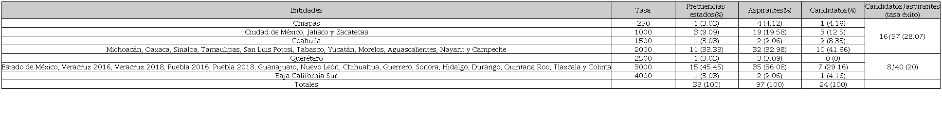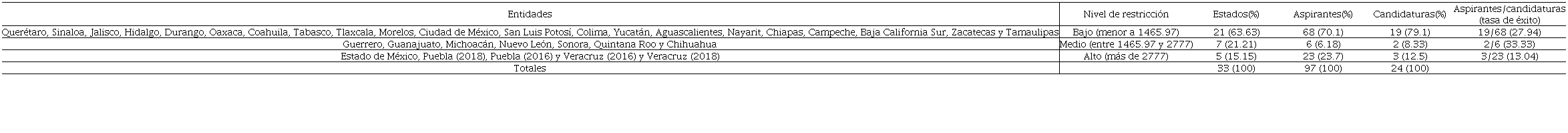 De un total de 97 aspirantes, los estados con bajo nivel de restricción efectivamente registraron casi el 70% (68), mientras que, de la suma de 24 candidaturas totales, este nivel incluyó casi 80% (19). Los dos siguientes niveles de restricción tienen comportamientos inesperados debido a que el nivel medio de restricción contribuyó con 6.18% de los aspirantes y con 8.33% de las candidaturas logradas, mientras que el nivel alto de restricción registró 23.7% de aspirantes y 12.5% de candidaturas logradas. Hubo mejores cifras en el nivel alto que en el nivel medio. En cuanto a la tasa de éxito, es decir, la proporción de candidaturas logradas en relación con el total de aspirantes por nivel, los resultaron fueron de 27.9, 33.3 y 13 para los niveles bajo, medio y alto, en ese orden.