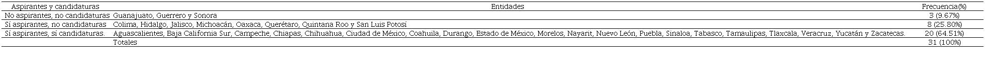Cabe mencionar que tres entidades emitieron convocatorias, pero carecieron de registros empíricos (Guanajuato, Guerrero y Sonora). De las restantes 28 entidades, se recopilaron datos de 97 aspirantes, de los cuales 24 lograron su inclusión en la boleta y 73 fueron excluidos; 6 entidades registraron el mínimo de un aspirante43 y una entidad registró el máximo con 12 aspirantes;44 de 20 estados que registraron candidatos, 17 tuvieron el valor mínimo de un candidato independiente en la boleta45 y un estado tuvo el máximo de 3 candidatos independientes.46 Este conjunto de datos se obtuvo de periódicos locales, memorias electorales e información publicada por el Instituto Nacional Electoral (INE) y organismos electorales locales.