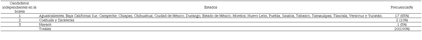 De los 20 estados que registraron candidatos en la boleta, 17 (85%) registraron una, 2 entidades (10%), evidencian 2, y una (5%) alcanzó 3 candidatos independientes (cuadro 6). Cabe mencionar que Coahuila, Zacatecas y Nayarit revelan consistencia al registrar más de un candidato independiente y bajo nivel de restricción.