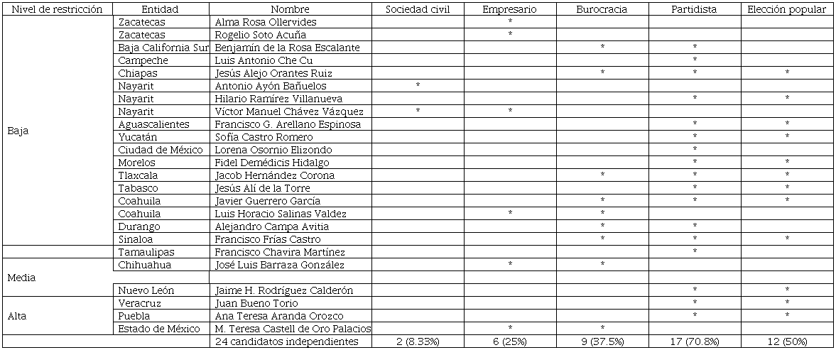 De 97 aspirantes, el indicador de firmas por día muestra que el 70.1% corresponde a los estados con restricción baja mientras que el indicador tasa de restricción por cada 100 000 inscritos en la lista nominal muestra que 58.76% proviene del grupo de estados con restricción baja; de los 24 candidatos independientes registrados en la boleta, el primer indicador muestra que fueron el 79.1% del nivel de baja restricción, mientras que el segundo indicador atribuye el 66.66% al nivel bajo de restricción.