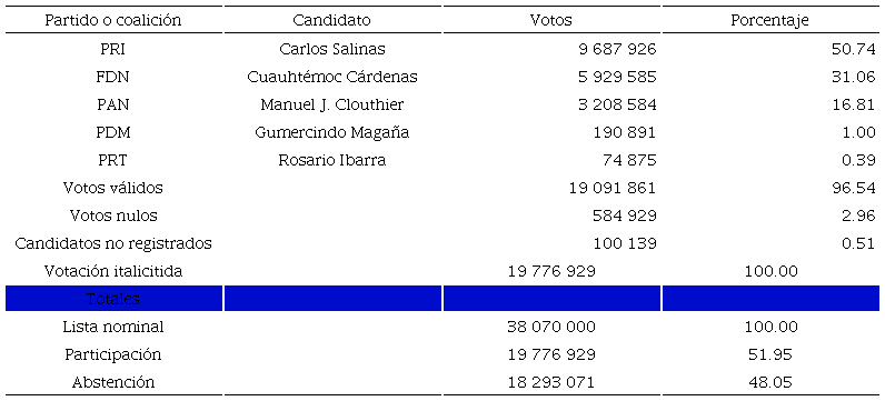 El 7 de julio, el presidente del PRI, Jorge de la Vega, anunciaba que el aspirante priista Carlos Salinas había ganado los comicios de manera “contundente, legal e inobjetable”. Al día siguiente, Salinas pronunciaba un discurso aceptando el crecimiento electoral de la oposición y afirmando que “la época del partido prácticamente único” había terminado (hechos que quedaron consignados en los periódicos de la epóca). Las cifras finales eran: el PRI obtenía el 50% de los votos, el FDN el 31% y el panista Manuel J. Clouthier el 17% (ver cuadro 1). Estos resultados no correspondían a lo vivido en el proceso electoral.