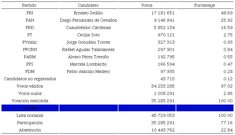 En una atmósfera de zozobra, inestabilidad y violencia, llegó la jornada electoral. En la elección presidencial emitieron su voto 19 106 176 ciudadanos, equivalente a 50.28% de la lista electoral, es decir, se registró un 49.72% de abstencionismo. La cifra más alta en este sentido “conocida en una elección presidencial en los tiempos del priato”.16 Esto es, si tomamos como referencia la población total nacional con derecho a votar (52.2 millones), tenemos que sólo 36% sufragó y 64% se abstuvo.17