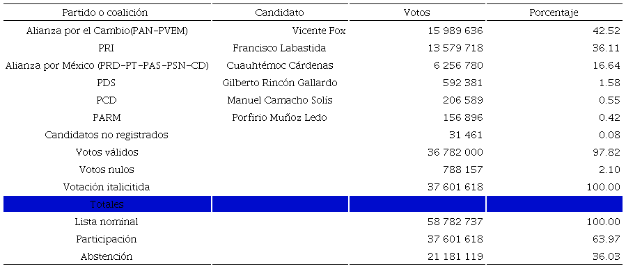Así, el 2 de julio de 2000, en unas históricas elecciones, el PAN ganó la presidencia. El PRI, después de 71 años de gobernar, fue derrotado. Este hecho representó la culminación de un largo proceso construido desde la periferia, cuando los partidos de oposición fueron poco a poco obteniendo triunfos en presidencias municipales, congresos locales y gubernaturas, hasta llegar al centro. En el ámbito electoral, lo local fue transformándose gradualmente hasta impactar en lo nacional. Aquel memorable día, los resultados fueron: 42.52% de los votos para Fox; 36.11% para Francisco Labastida, y 16.64% para Cárdenas (ver cuadro 3).