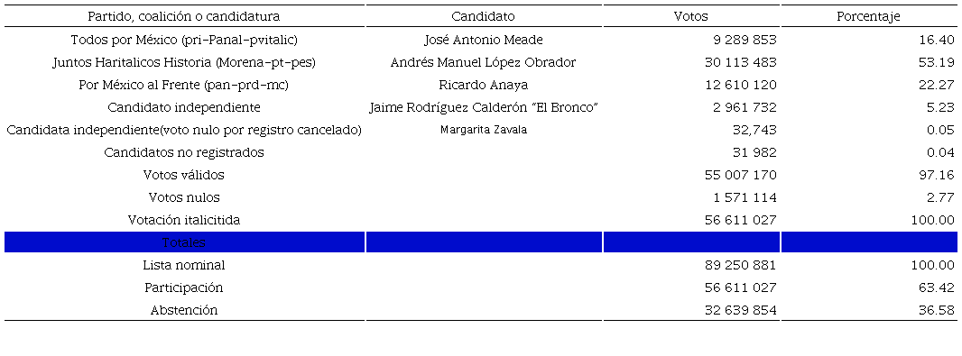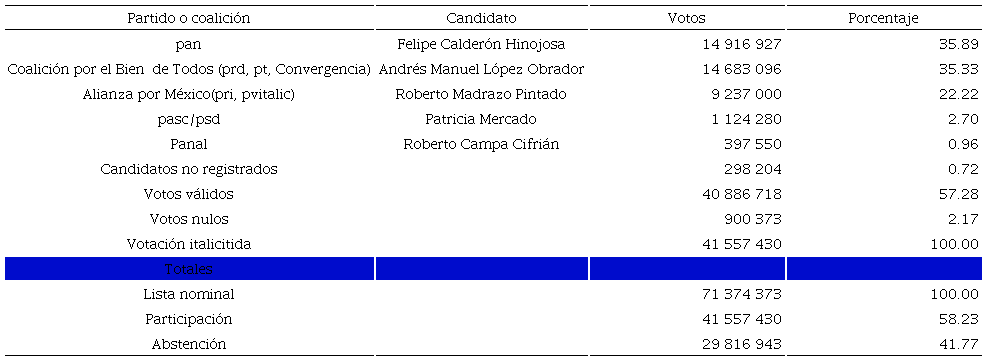 En este ambiente, llegó la jornada electoral y su desenlace. Al finalizar el cómputo en los distritos electorales, se anunciaba que Peña Nieto tenía el 38.21%, AMLO el 31.59% y la panista Josefina Vázquez Mota el 25.42% (ver cuadro 5).