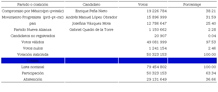Ante los resultados, el PRD argumentó que había sido “avasallador el comportamiento de los aparatos gubernamentales”, comprando alrededor de cinco millones de votos en todo el país. Frente a la corrupción, coacción y compra del voto priista (casos Monex y Soriana), López Obrador y su equipo impugnaron la elección. Lo que subyacía a este alegato era que el TEPJF no era únicamente un órgano de legalidad, sino también de constitucionalidad, por lo que debía revisar y corregir las violaciones a la Constitución. También se impugnaba la injerencia de Televisa y el uso de las encuestas como mecanismo para impactar en la opinión pública. Finalmente, después de varias impugnaciones de la coalición de izquierda, el TEPJF emitía su fallo en favor de Peña Nieto, declarando válida la elección y presidente electo al candidato priista. El retorno del PRI a la presidencia era asunto consumado.