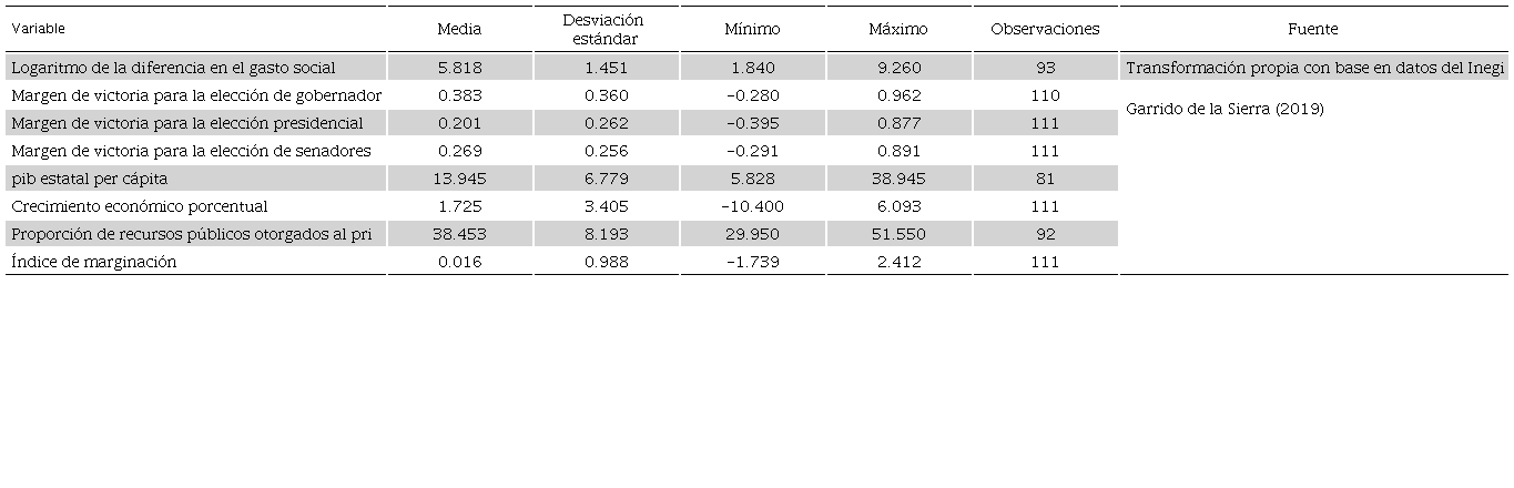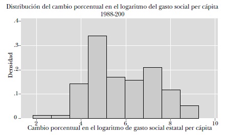 La variable de resultado es una transformación logarítmica que captura cambios porcentuales en los valores de las transferencias, asignaciones, subsidios y otras ayudas. Sin embargo, sólo se utilizan los valores que corresponden al gasto social erogado por los estados y el Distrito Federal (D.F.) durante el periodo de estudio. Se toma ventaja de que el Inegi publica los datos desglosados y se incorporan las transferencias a instituciones y programas de educación, salud, asistencia social, seguridad social, así como las ayudas sociales a personas, becas y ayudas a instituciones de enseñanza.