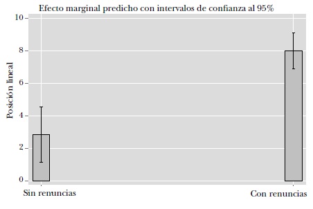 En lo que refiere a la interacción entre renuncias y el margen de victoria para la elección de senadores, se encuentra un efecto más acentuado. En ambas rectas, conforme más pequeño se hace el margen de victoria (mayor competitividad), mayor es el incremento porcentual del gasto social. Este incremento es especialmente notable en presencia de rupturas. No obstante, cuando el margen de victoria tiene valores negativos (el PRI queda en segundo lugar), la interacción pierde su significancia. En este caso, es claro que el efecto de las rupturas es mayor conforme más competitiva es la elección a senadores, pero cuando el PRI pierde la elección, las rupturas ya no muestran una diferencia significativa.