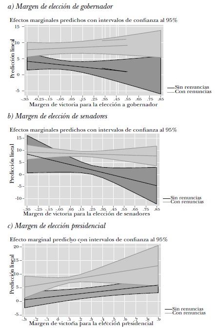 Las últimas tres columnas del cuadro 3 contienen los hallazgos para H2, en donde argumento que los autócratas que se enfrentan a rupturas en la élite antes de elecciones ejecutivas competitivas serán más propensos a incrementar el gasto social. Los modelos 6 a 8 incluyen la interacción entre la variable dicotómica de renuncias con los diferentes márgenes de victoria entre el PRI y el segundo lugar para tres tipos de elección (presidente, gobernador y senadores). El efecto de las renuncias mantuvo el mismo efecto positivo y significativo (p<0.01 en los tres casos). En contraste, hay variaciones en los coeficientes individuales de los márgenes de victoria, así como en los términos interactivos. Sin embargo, no es correcto interpretar los términos independientes de un efecto interactivo, ya que hay que considerar que la interacción en su conjunto es el efecto marginal.70 En consecuencia, la gráfica 3 muestra los efectos marginales para las tres interacciones.