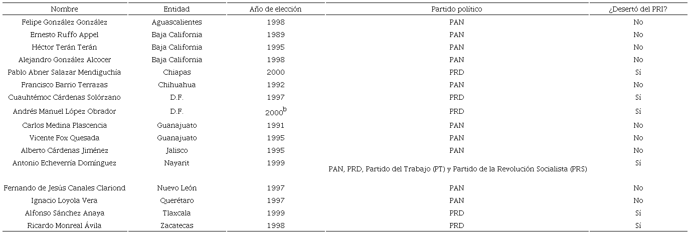 Sobresale que seis de 16 gobernadores opositores al PRI son desertores de este partido. En otras palabras, el 37.5% de los gobiernos de oposición durante el régimen autoritario en México provienen de una ruptura en el interior del partido oficial. Resaltan ejemplos como el de Cuauhtémoc Cárdenas, electo como jefe de gobierno del Distrito Federal (D.F.) en 1997, y el de Andrés Manuel López Obrador, quien rompió con el PRI a finales de los años ochenta y fue electo jefe de gobierno del D.F. en 2000. Ambos fueron postulados por el Partido de la Revolución Democrática (PRD), partido resultante de la ruptura de Cárdenas.