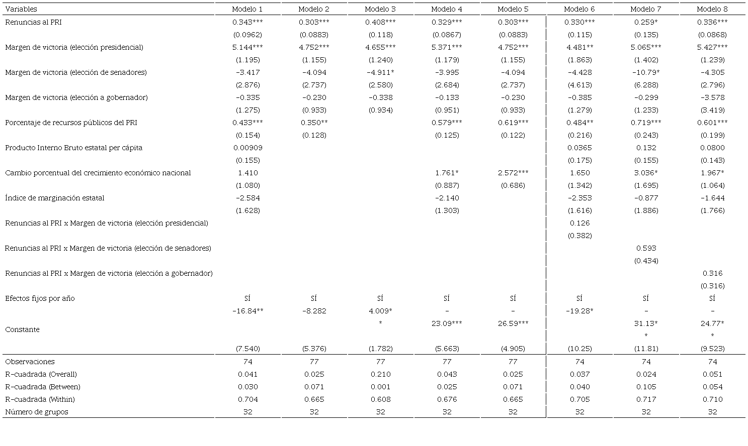 El cuadro 1 muestra que las rupturas en las burocracias estatales del PRI podrían desestabilizar al régimen al colocar gobernadores de oposición. Sin embargo, existieron más deserciones que, si bien no se convirtieron en gobiernos opositores, sí amenazaron al régimen. En consecuencia, para analizar el efecto de las deserciones, especifiqué diversos modelos tipo panel con datos agregados.