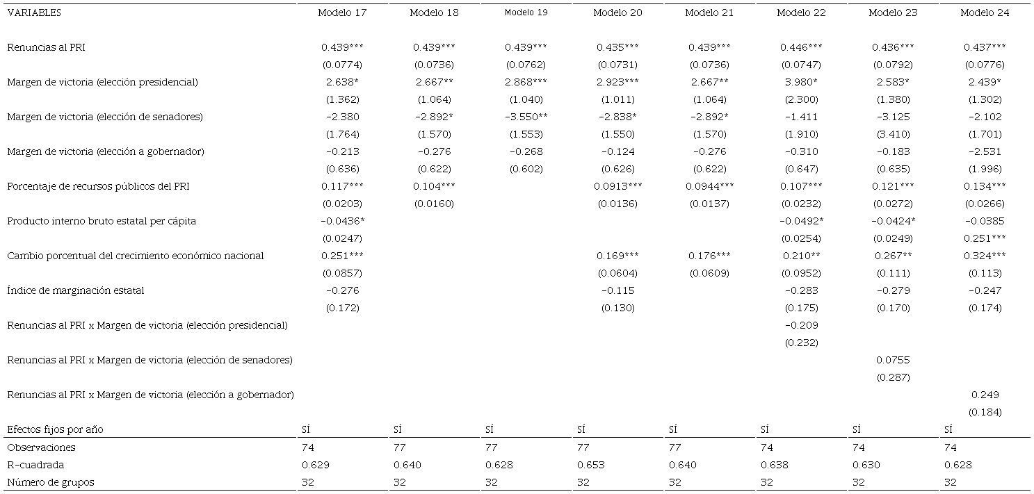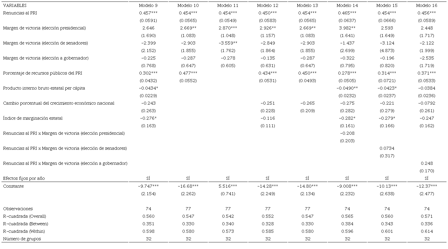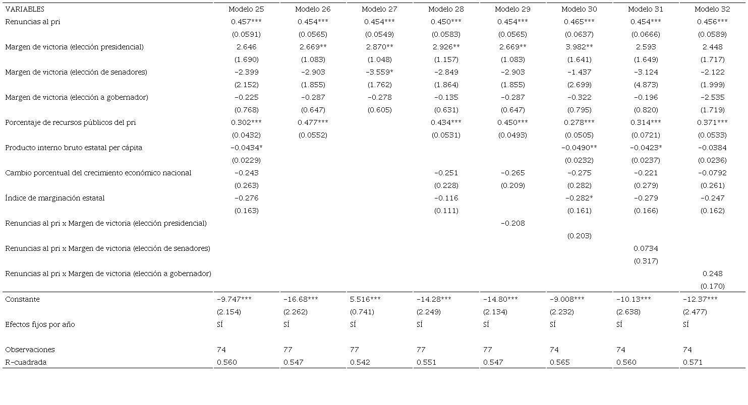 Todos los modelos controlan por potenciales variables que se prestan a la confusión.62 El conjunto de controles políticos incluye el margen de victoria (porcentaje) entre el PRI y el segundo lugar para elecciones gubernamentales, del Senado y de la Presidencia.63 El objetivo de estas variables es capturar la competitividad de diferentes elecciones. Debido a que dichas elecciones no son siempre concurrentes, utilizo valores presentes de la elección a gobernador y tomo los valores de la elección inmediatamente precedente para los procesos de elecciones federales. De la misma forma, también especifiqué efectos interactivos entre los tres márgenes de victoria y la presencia de renuncias al PRI de contendientes a gobernador.