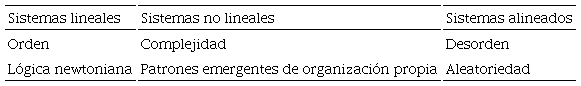 Los sistemas pueden clasificarse como lineales, no lineales o alineados.41 Los casos en los que es posible aplicar la lógica newtoniana se denominan sistemas lineales, mientras que los sistemas complejos se entienden como sistemas no lineales. Robert Geyer42 también distingue los sistemas alineados. En estos casos predomina el desorden y la aleatoriedad, a diferencia de los patrones emergentes de organización propia de los sistemas complejos (no lineales) o la relación unidireccional de causa y efecto de los sistemas lineales. El cuadro 1 resume esta clasificación.