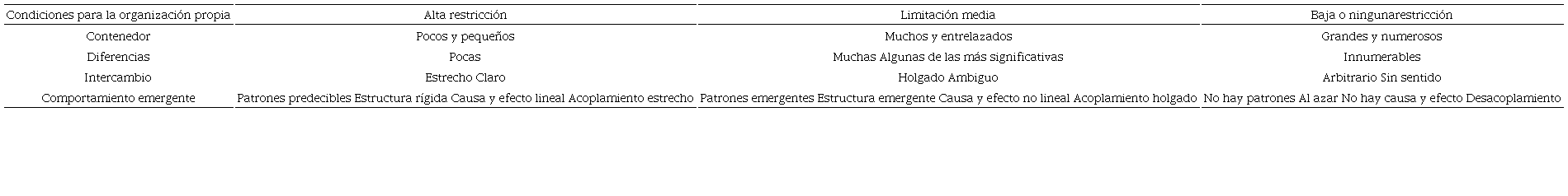Hasta cierto punto, el cuadro 2 se asemeja a la categorización del cuadro 1. Los esquemas de restricción alta reflejan las propiedades de los sistemas lineales, en los que es posible aplicar una lógica newtoniana, mientras que los de restricción baja o nula tienen características similares a los sistemas alineados, como la aleatoriedad. Los casos de restricción media, por su parte, se refieren a sistemas no lineales, es decir, a sistemas adaptativos complejos.