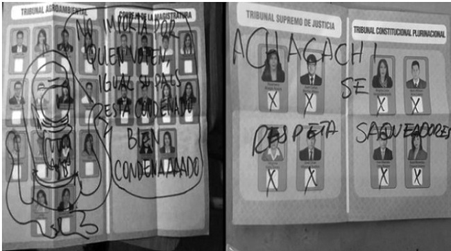 Un momento clave de desilusión con las instituciones gubernamentales para la mayoría de los bolivianos fue cuando Morales hizo caso omiso de los votos populares contra su candidatura a la reelección. En el referéndum del 21 de febrero de 2016, el 51% de los bolivianos votó “NO” a la petición de Morales de que se le permitiera presentarse a la presidencia para un cuarto mandato. Sin embargo, a finales de septiembre de 2017, el Tribunal Constitucional, ampliamente considerado como carente de independencia política, dictaminó que Evo podía ser candidato después de todo. El dictamen se dio pocos días antes de las elecciones judiciales populares para elegir a los jueces de todo el país, incluido el Tribunal Constitucional. Con casi la mitad de los votos en cada departamento registrados como “votos nulos” el día de las elecciones, quedó claro que el proceso de selección independiente de jueces carecía de legitimidad pública.14 Los votos nulos se oponían directamente a la candidatura de Morales a la reelección, y las imágenes de las papeletas que criticaban al gobierno se compartieron ampliamente en las redes sociales (véase la imagen 1). Así que, incluso antes de las elecciones presidenciales de 2019, había una desconfianza masiva en los tribunales.