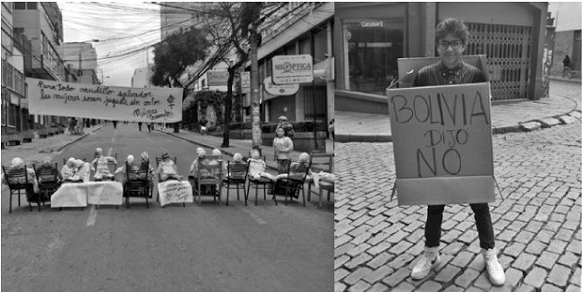 Es importante destacar que la plataforma del partido de Mesa, Comunidad Ciudadanía (CC), captó el descontento de un amplio abanico de grupos, incluido el de los líderes indígenas de la oposición, los ecologistas y los defensores de los derechos humanos. Éstos fueron los bolivianos que participaron en diversas formas de desobediencia civil antes de las elecciones, tales como los movimientos del F21 y ¡Bolivia Dijo No! (véase la imagen 2). Aunque muchos líderes indígenas de la oposición apoyaron a Mesa, su plataforma progresista era fundamentalmente liberal y, por tanto, carecía de la visión plural para la toma de decisiones y la participación de las organizaciones sociales que originalmente planteaban aquellas que formaban el MAS. De hecho, eso fue quizá lo más destacable de las concentraciones a favor del MAS y de la oposición que impugnaban la cuarta candidatura de Morales a la reelección: prácticamente no había wiphalas, la bandera multicolor que representa a los pueblos indígenas bolivianos, en ninguna de ellas.
