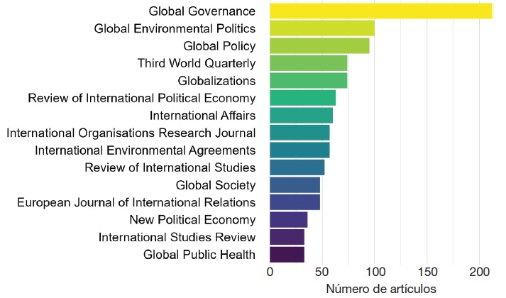Esta pesquisa arrojó un conjunto de datos que contiene 5012 artículos de más de 100 revistas. En la figura 1 se hace una lista de las publicaciones más importantes y del número de artículos editados sobre el tema que nos atañe. Ciertamente, éste no es todo el “universo” de artículos sobre el tema. De hecho, nuestro enfoque tiene algunas limitaciones. En primer lugar, muchos de éstos pueden tratar sobre “gobernanza global” o ser relevantes de alguna manera, pero no usan el término o una variante específica del dominio. En cambio, pueden usar términos como “gobernanza transnacional”, “orden mundial” u “organización internacional”, que inevitablemente se filtran a través de nuestra “red”. En segundo lugar, si bien los libros y los capítulos de libros también han sido medios importantes, éstos no aparecen aquí. En tercer lugar, aunque los artículos en el conjunto de datos están escritos en muchos idiomas y provienen de todas las regiones, podría haber un sesgo hacia aquellos que se han elaborado en América del Norte y en Europa occidental por estar mejor documentados en los conjuntos de datos subyacentes o por haberse publicado en inglés. Y, por último, puesto que nuestro enfoque diverge de los esfuerzos anteriores, como el proyecto TRIP, que se dedica a examinar los “artículos de RI” en un conjunto modesto de revistas académicas de alto perfil, las comparaciones directas, aunque siguen siendo ilustrativas, han de valorarse con cierto grado de precaución. Estas consideraciones deben tenerse en cuenta al interpretar los resultados. Sin embargo, la técnica en la que nos basamos logra captar un panorama cabal y probablemente bastante representativo de todos los artículos publicados hasta la fecha que, de forma directa, están más relacionados con el estudio de la gobernanza global.