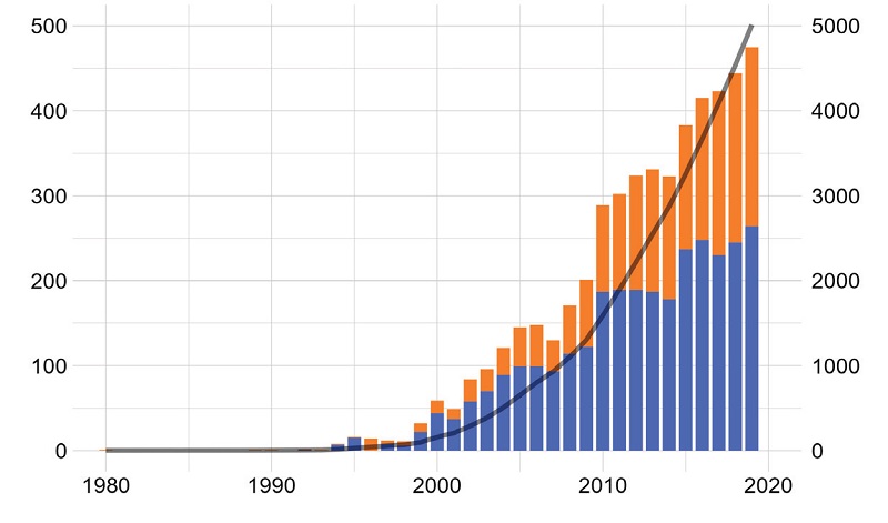 Dicho esto, si nos fijamos en las cifras, surgen dos hechos llamativos. En primer lugar, el uso de términos específicos de dominio como “gobernanza económica global” y “gobernanza ambiental global” se ha convertido en característica importante de la bibliografía especializada. En la figura 2, desglosamos las publicaciones anuales en las que se utilizan dichos términos (en naranja) y las que simplemente se refieren a la “gobernanza global” (en azul). Esto muestra que antes de 1999, “gobernanza global” era el término principal al que recurrían los académicos y aparecía en el 75 a 90% de todos los artículos. Desde entonces, sin embargo, la participación ha disminuido constantemente. En la actualidad, sólo el 55% de los artículos usan por sí solo el término más general.24 En segundo lugar, pero en estrecha relación con lo anterior, las cifras generales sugieren que la investigación no ha aumentado a un ritmo constante: en cambio, se ha caracterizado por tres “olas” de publicación.25 En concreto, podemos identificar una primera fase formativa que transcurre entre 1980 y 1998, en la que el número de artículos fue relativamente bajo, con una media de 7 por año; una segunda, entre 1999 y 2008, en la que se alcanza una nueva media anual de unos 104 artículos, y una tercera, de 2009 a 2019, en la que se publican más de 300 artículos anuales.