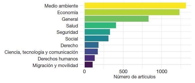 Dicho esto, hay formas en que la bibliografía refleja básicamente que en la disciplina más amplia se siguen ciertos patrones. Por ejemplo, después de los temas ambientales, los artículos sobre problemas económicos son la segunda variedad más común. Tomando en cuenta el 25% de todos los temas que han surgido, esto es sólo marginalmente más habitual que el 18-19% del profesorado de RI que, en promedio, y en todas las regiones, enumera la EPI como su campo de investigación primario o secundario.32 Y si nos limitamos a las cifras de América del Norte y Europa occidental, donde tradicionalmente se ha concentrado la investigación de RI, las proporciones son prácticamente idénticas. Varias áreas que han recibido relativamente menos atención en ri también parecen estar marginadas en la bibliografía sobre gobernanza global. Los artículos sobre migración y derechos humanos, por ejemplo, temas que se han caracterizado por ser relativamente periféricos en RI, son algunos de los menos comunes en nuestro conjunto de datos, ya que representan menos de 4% del total, aunque el estudio del primero ha ido aumentando desde que comenzó la crisis migratoria en 2014.