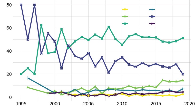 ¿El estudio de la gobernanza global es único? Nuestros datos revelan un panorama diverso. De alguna manera, encontramos que lo es. La figura 3 muestra que la variedad de artículos más frecuente en el conjunto de datos se centra en cuestiones ambientales. Dichos estudios representan más de una cuarta parte del total y el número publicado cada año ha crecido constantemente, pasando de alrededor de 15% en 1995 a casi 30% en 2019. Por lo tanto, un área temática que ha sido marginada en RI es la más común entre la bibliografía especializada sobre gobernanza global. El caso de la seguridad es casi lo contrario. Como lo señalamos supra, la investigación en RI ha mostrado propender hacia esta área: en todo el mundo, la seguridad se encuentra entre los campos de investigación más comunes.31 Sin embargo, cuando se trata de gobernanza global, los artículos sobre seguridad son comparativamente limitados y representan sólo 6% en general. Su porcentaje de publicaciones anuales también ha disminuido con el tiempo y ha pasado de 10% en 2000 a 5% en 2019. Por lo tanto, parece haber diferencias entre la investigación sobre gobernanza global y el resto de las RI.