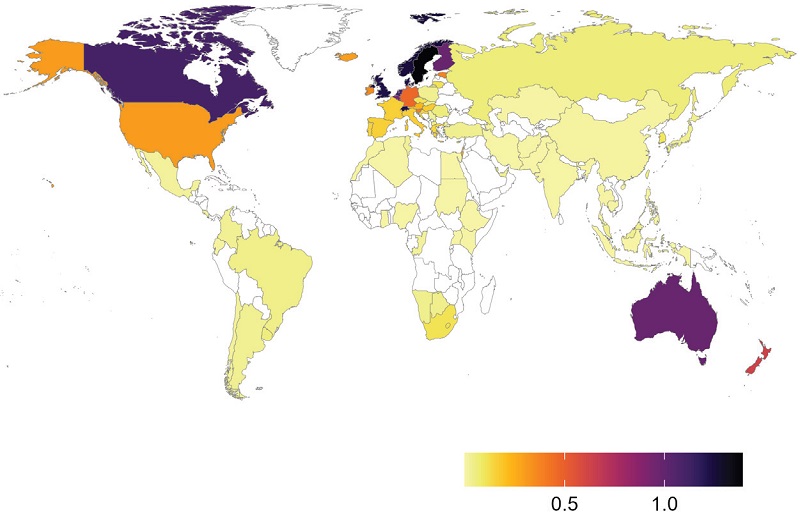 Estos diferentes énfasis son aún más llamativos cuando ponderamos las publicaciones por tamaño de población (figura 5). Esta medida no deja de ser problemática, pero nos da una idea de hasta qué punto regiones y países concretos han adoptado la investigación de la gobernanza global -qué tan comunes son estos artículos en general-. Aquí, los países de Europa occidental, Canadá y Australia están muy por delante y los estados nórdicos ocupan un lugar destacado. Per cápita, los dos principales editores de publicaciones son Suecia y Noruega. Les siguen Suiza, el Reino Unido, Dinamarca y los Países Bajos. Canadá y Australia, en séptimo y octavo lugar, respectivamente, son los únicos países no europeos que se hallan entre los diez principales. Estados Unidos, según esta medida, desciende hasta el decimonoveno lugar, lo que sugiere que la investigación en el país ha adoptado mucho menos las ideas de gobernanza global. Considerando toda esta información, en conjunto con los datos sobre las tendencias generales de publicación, es justo decir que, si bien las RI todavía pueden llegar a ser una “ciencia social estadounidense”, el estudio de la gobernanza global se ha convertido en gran medida en una ciencia social europea.