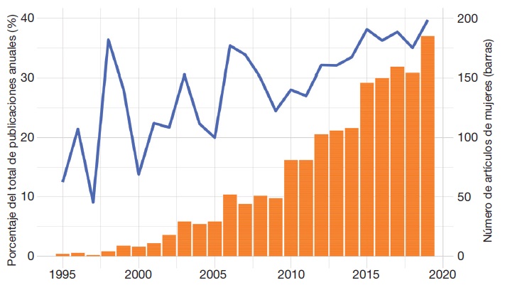 Preciso es ahora considerar el género de los autores. Cuando se trata de la participación de las mujeres en RI el panorama se torna bastante sombrío. Un estudio reciente, utilizando datos del proyecto TRIP, encontró que representaban únicamente 23% de los profesores de RI, y que en el periodo 2004- 2007 constituían sólo 19% de todos los autores. Nuestros datos muestran, por el contrario, que las mujeres han sido algo más activas en los debates sobre gobernanza global (véase la figura 6). En el mismo periodo 2004-2007, fueron los primeros autores de alrededor de 28% de todas las publicaciones. Tal cifra todavía está muy desequilibrada, pero la proporción es casi 50% más elevada que la del resto de los estudios elaborados en la disciplina.41 Desafortunadamente, no podemos comparar de manera directa las tendencias después de este periodo. Sin embargo, nuestros datos muestran que el número de mujeres que publican investigaciones sobre gobernanza global ha aumentado desde entonces. De hecho, entre 2015 y 2019, las mujeres fueron las autoras principales de 37% de las publicaciones, en promedio -una cifra que se acerca aproximadamente al 40% de quienes son miembros de la isa.42