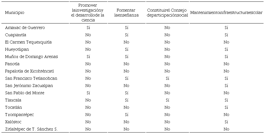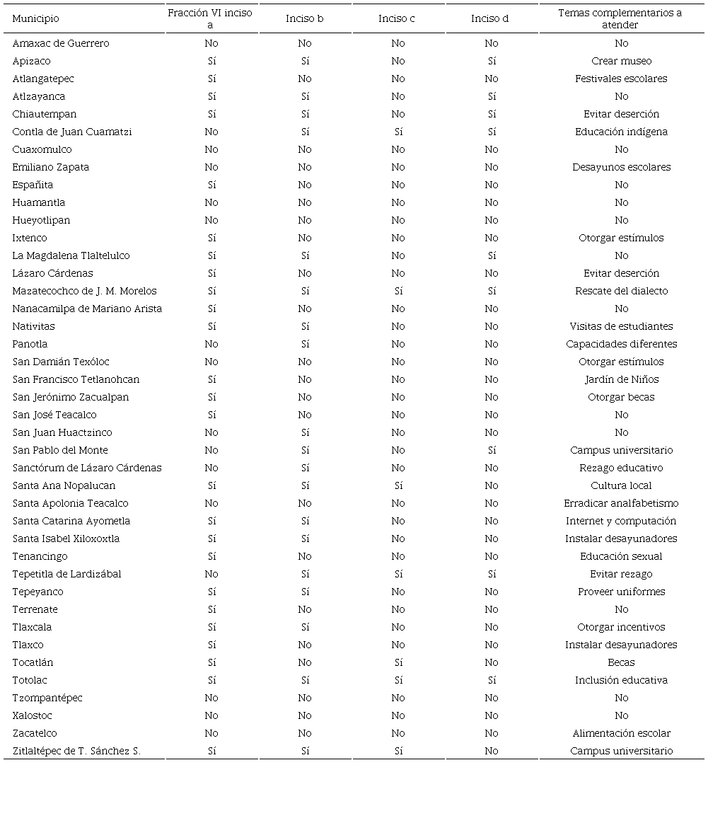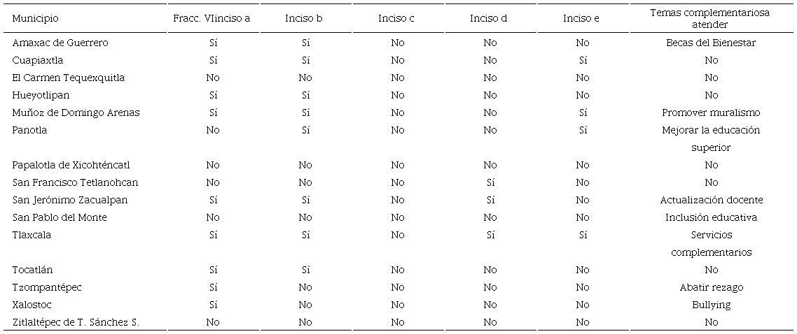 Por último, en materia normativa, la Ley Municipal del estado de Tlaxcala, en su artículo 47, establecía las responsabilidades en materia de educación pública en la fracción VI a través de cinco incisos:39