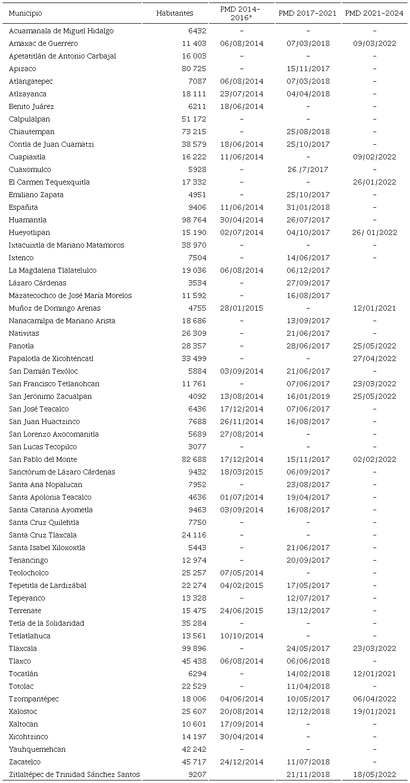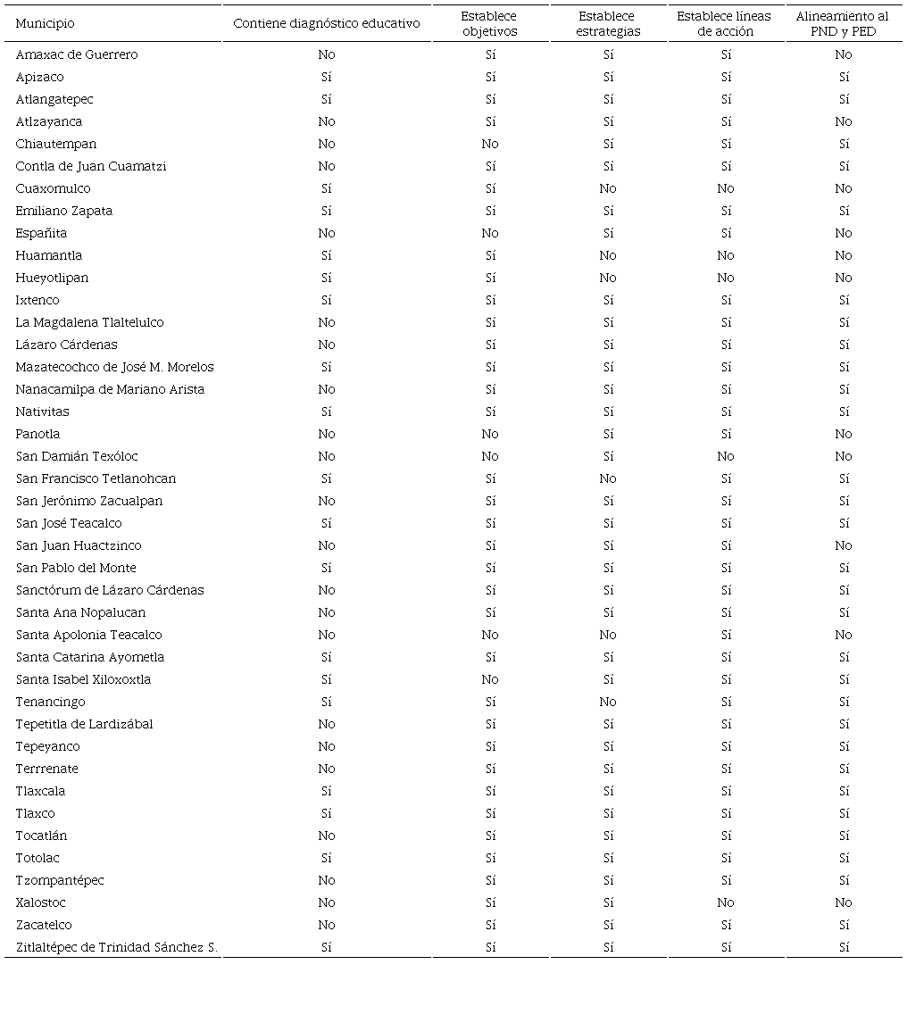 Esta investigación analizó las competencias legales que le son conferidas a los municipios en materia educativa y los elementos técnicos que debe contener un plan. Para atender los dos primeros incisos de la propuesta del párrafo anterior, se describió páginas atrás la existencia de legislación en materia educativa en los gobiernos locales. Sobre la presencia de mecanismos de política en los planes desarrollo, se revisaron los PMD publicados en el Periódico Oficial del Gobierno del Estado de Tlaxcala, correspondientes a los dos últimos periodos de gobierno.44 De un total de 60 municipios, 41 ayuntamientos cumplieron con publicarlos durante el periodo 2017-2021; para el periodo 2021-2024, a nueve meses de inicio del gobierno local, sólo lo habían publicado 15 municipios; tres antes de vencer el plazo legal de cuatro meses (previo a la reforma del 31 de enero de 2022) y siete en el nuevo plazo ampliado en gobiernos concurrentes. Para extender la base de información, se agregaron otros cinco planes debido a la disponibilidad registrada en el momento en que se hizo esta investigación (ver Anexo).