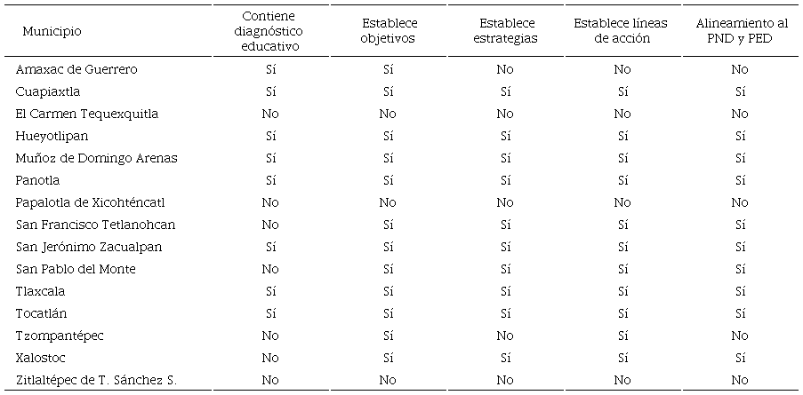 En el caso de Tlaxcala la agenda educativa plasmada en los planes municipales de desarrollo se encuentra poco apegada a las responsabilidades que le confiere la normatividad establecida en la Ley de Educación y la Ley Municipal. Aunado a lo anterior, los objetivos, estrategias y acciones de los planes de desarrollo no están relacionados con el diagnóstico -en los casos en los que existe- por lo que se perciben como poco sustentados en problemáticas estudiadas e incurren más en la rutina e inercia, que como respuesta a la dimensión o intensidad de situaciones detectadas. Esto conduce a enunciados de rutina o universales que son difíciles de cumplir a través de políticas públicas. Se reconoce que incorporar un problema a la agenda y plasmarlo en los planes no garantiza su ejecución, pero al sustentar su viabilidad con base en análisis técnicos y enunciados focalizados es más probable su materialización, además de mostrar orden y organización para el emprendimiento de actividades de gobierno.