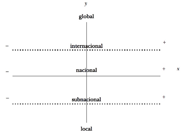 Ofrece una perspectiva desde la complejidad, al reconocer la variedad de actores implicados y sus posiciones en un determinado momento, que éstas son dinámicas, pues van de un extremo negativo a uno positivo, o se localizan en un punto entre estos dos opuestos. El positivo y negativo del plano cartesiano no poseen ningún ánimo normativo o ético, simplemente reflejan dos extremos opuestos. De igual manera, la perspectiva compleja reconoce que la gobernanza global en un tema es diferente según el contexto social, económico, político de un momento determinado, así como que no es una idea totalizadora, sino más bien que admite la fragmentación del sistema internacional y sus normas duras y suaves, difusa en distintos actores y redes.