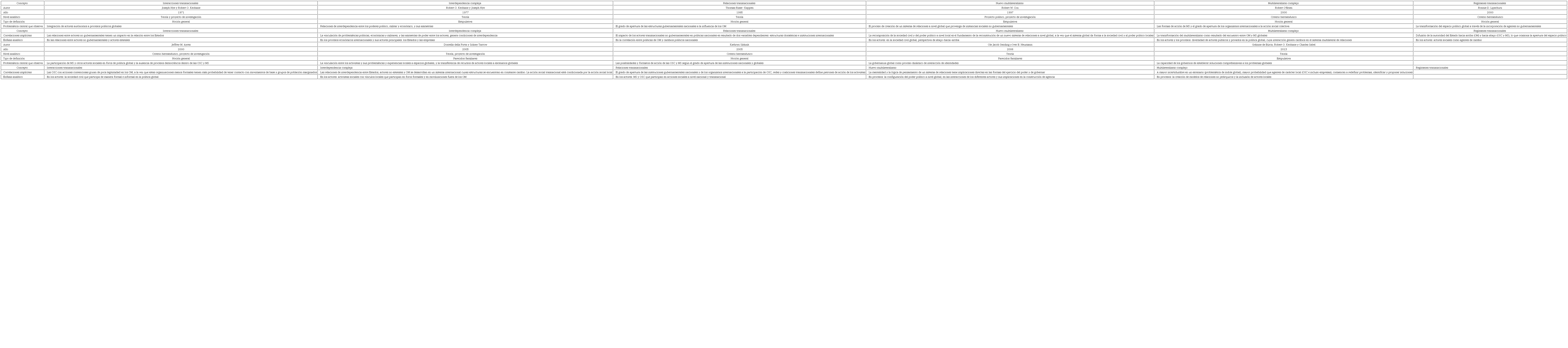 Es de la mayor relevancia señalar que los conceptos se presentan de manera muy resumida, lo que podría simplificar discusiones que merecen mayor profundidad y espacio en el debate académico de las RI, sin embargo, este artículo no pretende un debate profundo sino, más bien, una compresión amplia en el sentido del número de conceptos que se analizan, los cuales se observan a partir de determinados elementos para ofrecer una comprensión del desarrollo conceptual del término gobernanza global.