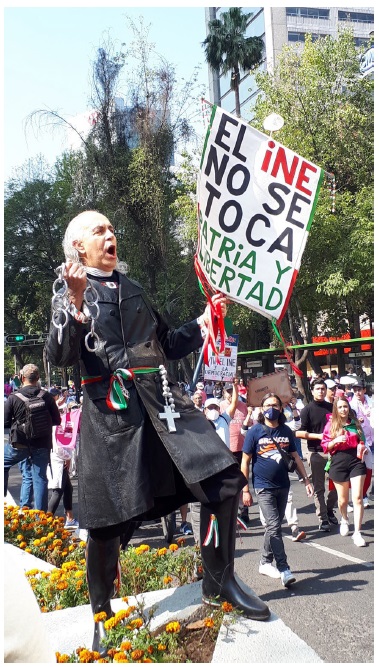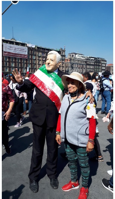 Esta heteróclita concurrencia formada por sectores populares urbanos y rurales y clases medias se identificaban como “el pueblo” y se manifestaban para mostrar su adhesión al gobierno de López Obrador, el proyecto de la 4T y, en particular, la reforma del INE, que consideran una institución corrupta, al servicio de los intereses de las clases dominantes y que, en su opinión, ha impedido el establecimiento de una “verdadera democracia” en México.34 Ese domingo de noviembre, el “pueblo” estaba presente en el corazón de la capital del país y se le veía contento, echando porras, haciendo ruido con matracas y silbatos y cantando consignas viejas y nuevas para la ocasión: “Es un honor, estar con Obrador”; “Educación primero, al hijo del obrero, educación después, al hijo del burgués” o “No somos acarreados, somos organizados”. A la altura del monumento a Cuauhtémoc, en la avenida Reforma, un grupo coreaba, con más convicción que métrica y rima: “Ciro, escucha, Lorenzo,35 entiende, qué honesto y valiente es mi presidente”; “INE, corrupto, por tu culpa estoy de luto” o “El país está endeudado, el pueblo no pidió, a dónde está el dinero, el PRIAN36 se lo robó”.37