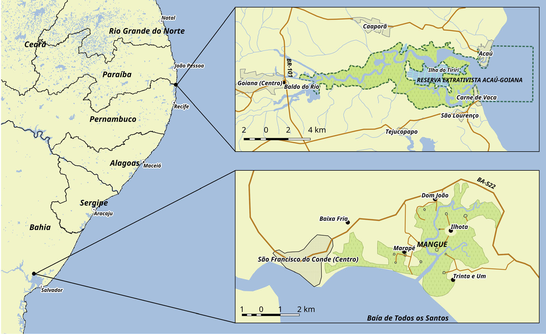 O presente trabalho é também resultado da participação dos autores nos debates públicos e atividades coletivas relacionadas a pesca e seus territórios, incluindo os referentes ao chamado ordenamento da pesca do guaiamum face à ameaça de proibição da atividade por motivos de conservação ambiental. As histórias aqui narradas[3] referem-se a duas paisagens: os manguezais do estuário do Rio Goiana, na divisa litorânea entre os estados de Pernambuco e Paraíba, onde existe desde 2007 a Reserva Extrativista Acaú-Goiana; e os manguezais do município de São Francisco do Conde, às margens da Baía de Todos os Santos no estado da Bahia, onde uma comunidade quilombola reivindica reconhecimento territorial desde 2008.