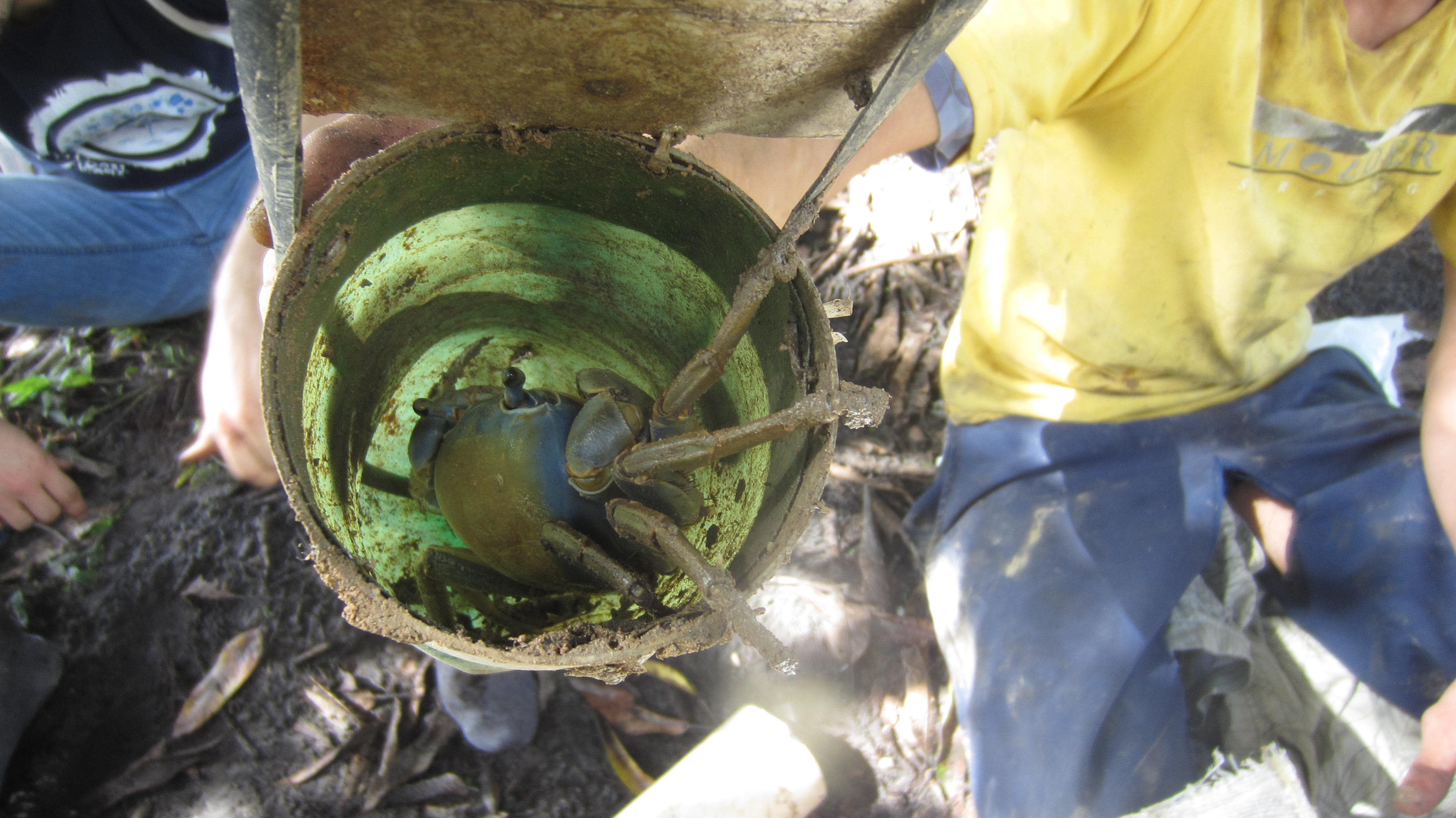 Foto: Fabiano Ribeiro/ Arquivo do projetoO porto onde paramos dá em uma vegetação de capins e arbustos. Jorge havia instalado as ratoeiras no dia anterior, vinha recolhê-las no dia em que o acompanhei e sabia exatamente onde elas estavam. Mesmo sendo na área de capim, as ratoeiras estavam colocadas em locais protegidos por vegetação. No caminho para a primeira ratoeira, Jorge vai me mostrando algumas tocas de guaiamum e dando uma estimativa se o animal daquela toca era grande ou pequeno. Me mostra também os rastros de bois e de capivaras que passaram pelo local. Os bois, diz ele, pisoteiam as ratoeiras; já as capivaras, deixam-nas em paz. Mais à frente me mostra rastros dos guaxelos, que são comedores de caranguejos e costumam levar para longe as ratoeiras para roubar os guaiamuns de dentro delas.