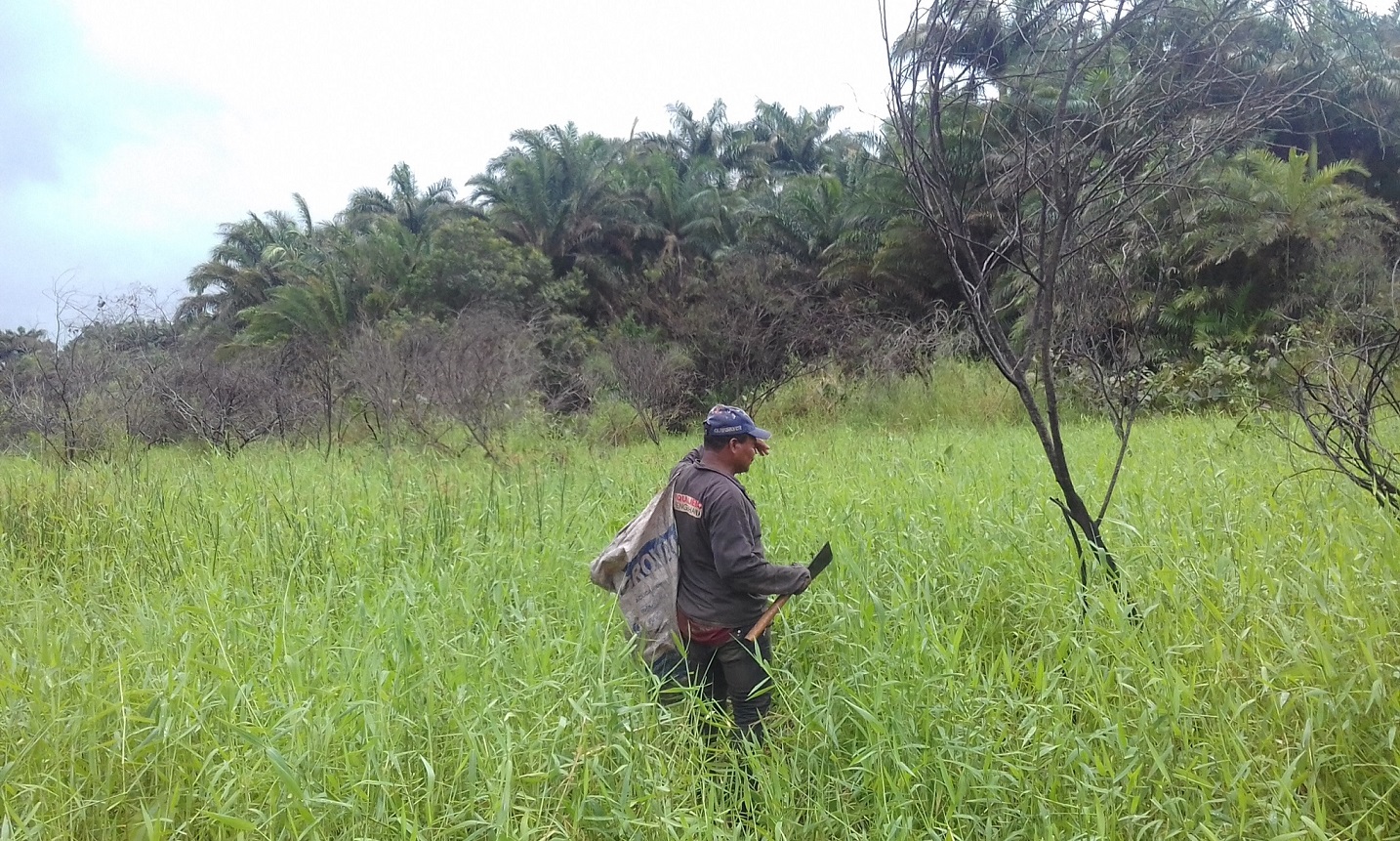Foto: Fabiano Ribeiro/ Arquivo do projetoFigura 3: Acompanhando Jorge na paisagem do guaiamum no estuário do Rio Goiana: área de capim com mata alagável ao fundo.