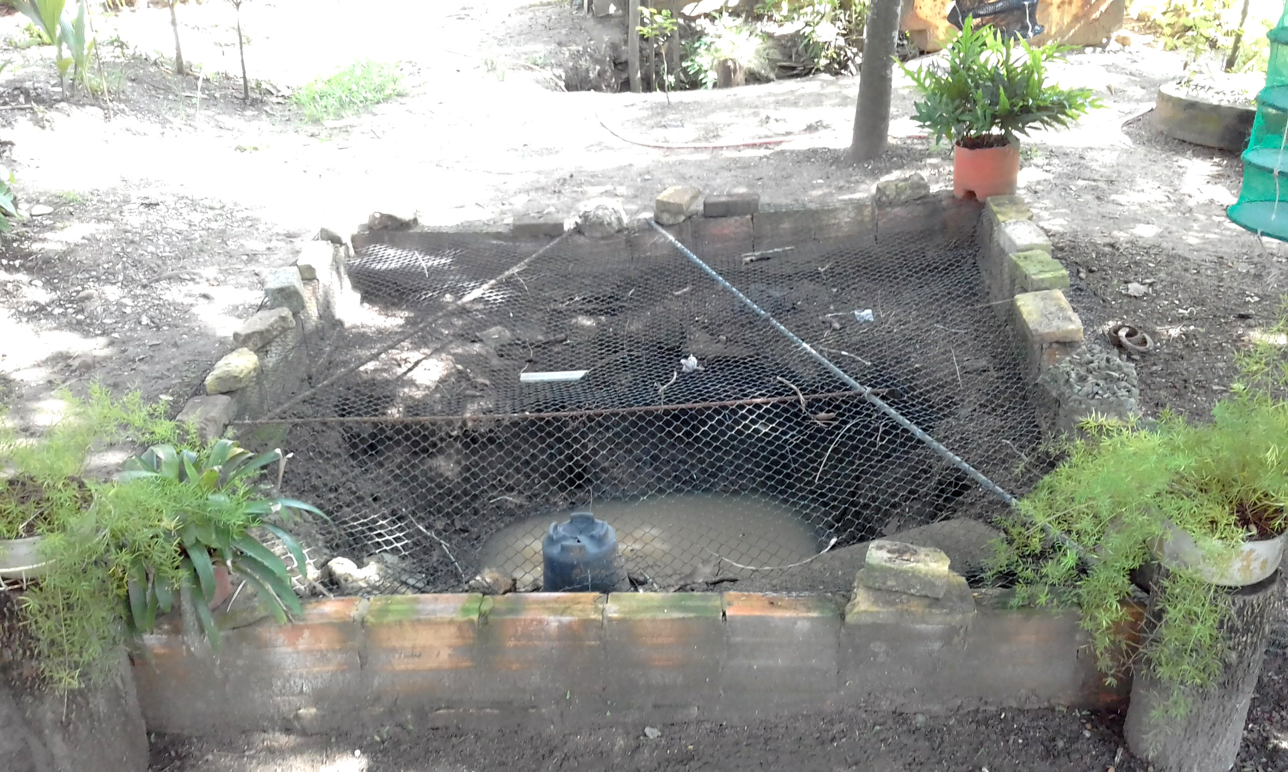 O berçário de guaiamum desenvolvido por Marcos em seu quintal a partir de seus conhecimentos pode ser entendido como uma prática de ressurgência. Trata-se de uma cavidade de um metro de profundidade por um metro e meio de largura cercada por tijolos e coberta por uma tela, cavado há mais de vinte anos na antiga viga de aço que sustentava uma refinaria de petróleo bruto extraído das profundezas do manguezal (Figura 6). Durante as duas primeiras andadas nas luas de janeiro e fevereiro, Marcos traz do mangue para seu quintal as gaiamunas chocas, ou patachocas, como são conhecidas as fêmeas ovadas. Ao colocá-las no berçário, ele as mantém protegidas até a lua cheia de março, conhecida como maré de março, quando as águas atingem seu ápice, correspondendo ao seu período de desova. A proximidade do berçário com o rio permite que aquele seja mantido pelo ciclo da maré.