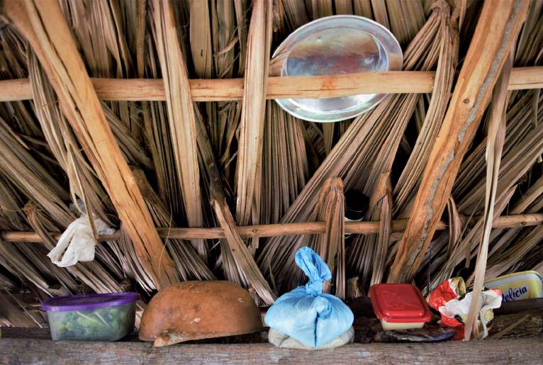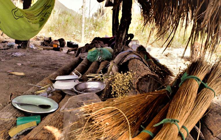 Crédito das imagens: Guilherme Moura Fagundes, Mateiros (TO), 2016.Figuras 4, 5 e 6 - Além de local de descanso das pernas e trabalho com as mãos, é também na rancharia onde se desenrola a partilha de histórias sobre as luvizias (assombrações) e façanhas do povo de primeiro. Nesta habitação, coberta com palhas de buriti, sempre haverá pratos, talheres e condimentos de cozinha (principalmente sal e óleo) para serem usufruídos pelos que ali passarem para pernoitar. A trempa (imagem 5) também é uma constante nestas instalações, pois apenas esta cuidadosa justaposição de três pedras consegue proteger o fogo doméstico do vento de gerais.