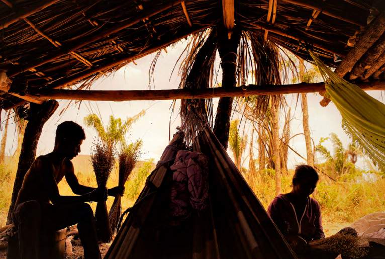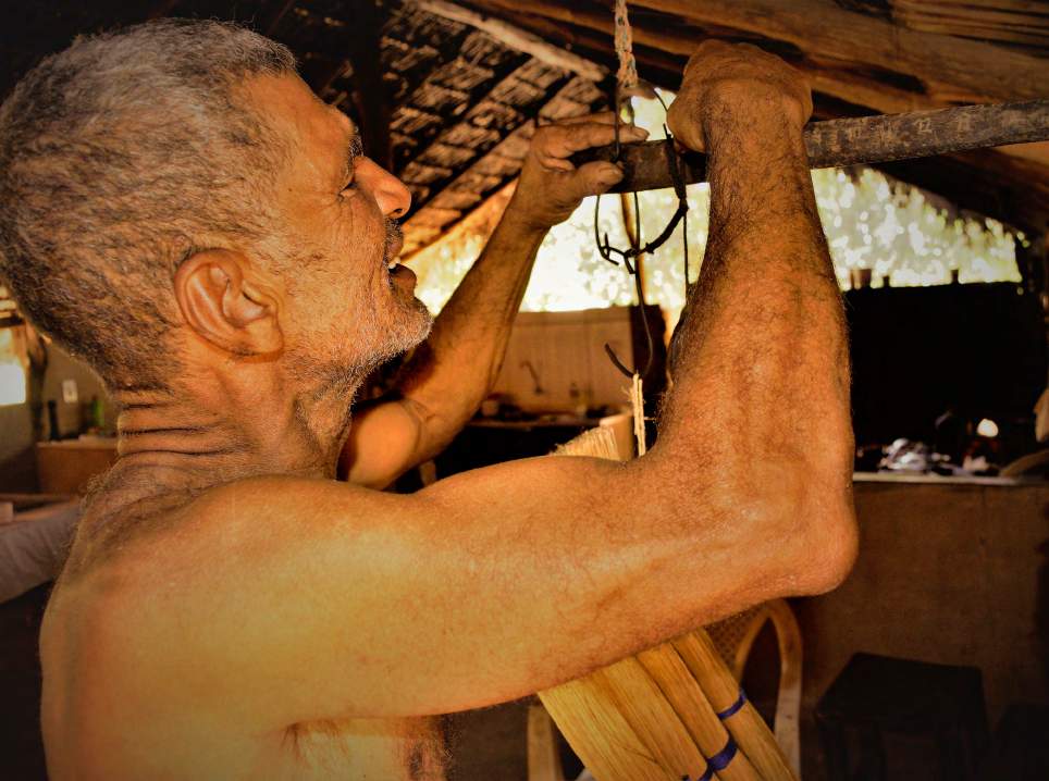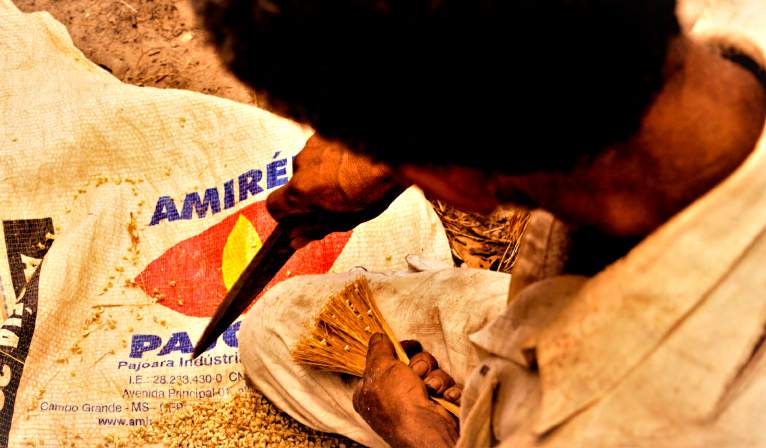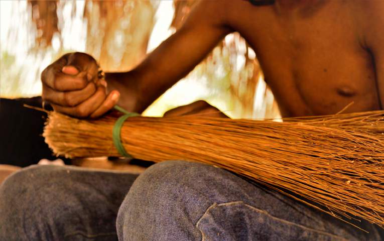 Crédito das imagens: Guilherme Moura Fagundes, Mateiros (TO), 2016.Figura 7 e 8 - A raspagem é uma condicionante dos órgãos ambientais para a permissão de colheita. Os relatos de geralistas multados por não terem raspado as flores e as deixado no campo nutrem receios de maus encontros com agentes de fiscalização. Ainda que não fosse uma obrigação, Deni sabe que só assim o capim poderá renascer nas veredas. Chegando na rancharia, enquanto Iracema e Belarmina preparam o cozido, Deni e Dieison se dedicam a esta que é uma etapa bastante trabalhosa. Munidos de facas bem amoladas e apoiando os maços sobre uma das pernas, algumas horas são necessárias para finalizar a tarefa.