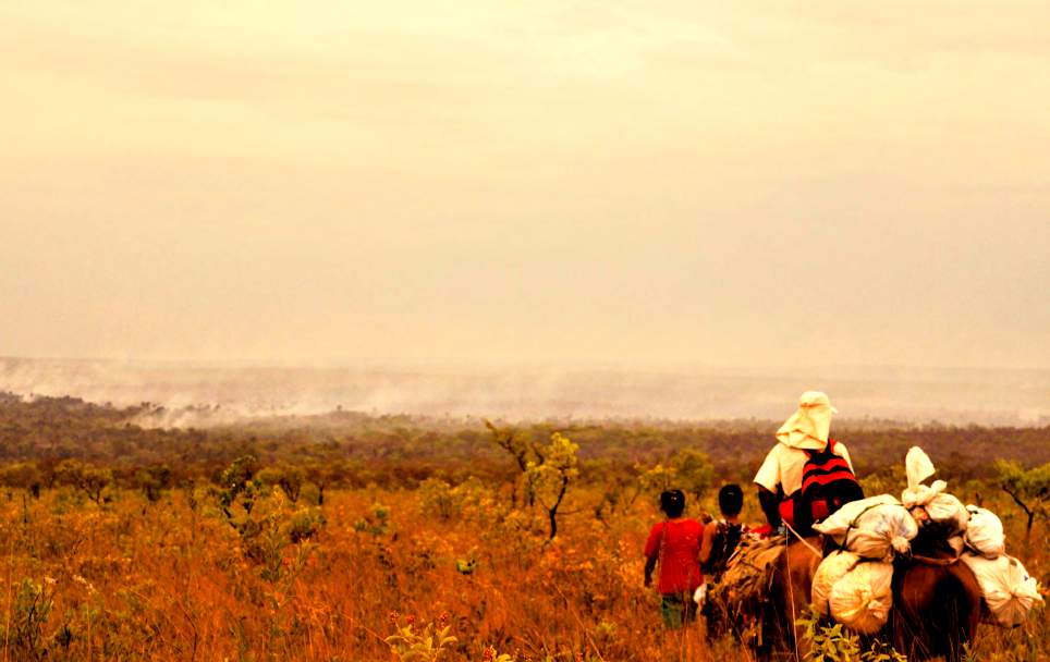 Figura 1 - O Jalapão é tido como uma das regiões mais inflamáveis do país. Tal configuração se dá tanto em razão de seus ecossistemas pirofíticos, cuja inevitabilidade de queima é iminente, como ainda pela importância das queimadas no modo de vida geralista. No gerais, o fogo feito para alimentar o gado conflui com o capim-dourado: enquanto o gado se alimenta dos brotos de uma queimada feita no mesmo ano, já o capim-dourado vem forte apenas nas vargens de veredas queimadas no ano precedente. É por isso que a subida para o gerais não deixa de ser um reencontro com lembranças que as famílias possuem acerca das temporalidades das áreas queimadas. Reconhecer o papel do fogo nesta verdadeira trama de natureza e cultura é o primeiro passo para adentrarmos no universo do capim-dourado.